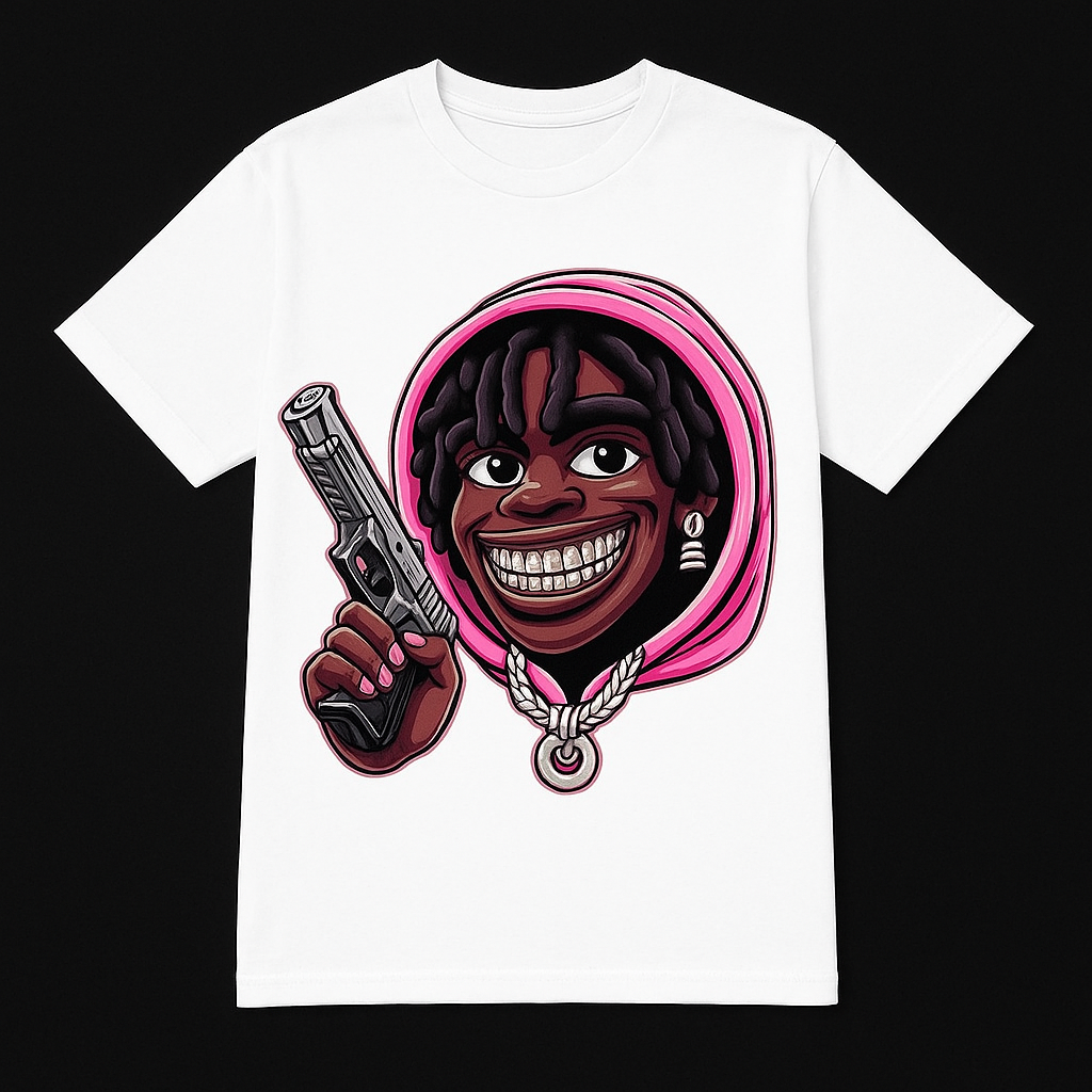 Stand out in style with this bold streetwear-inspired T-shirt. Featuring a striking cartoon-style illustration of a character in a vibrant pink hoodie, rocking iced-out grills, a heavy chain, and holding a detailed design element, this shirt captures urban energy and fearless attitude. Printed with high-quality DTF technology, the colors are sharp, vibrant, and built to last through washes.
